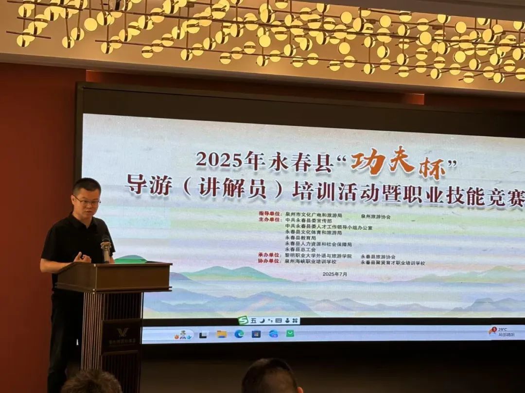 7月4日上午,2025年永春县“功夫杯”导游(讲解员)培训活动暨职业技能竞赛开班仪式在永春维也纳酒店正式启动。活动吸引了全县众多导游、讲解员行业从业者及爱好者踊跃参与,标志着为期12天的系统培训与技能比武正式拉开帷幕。