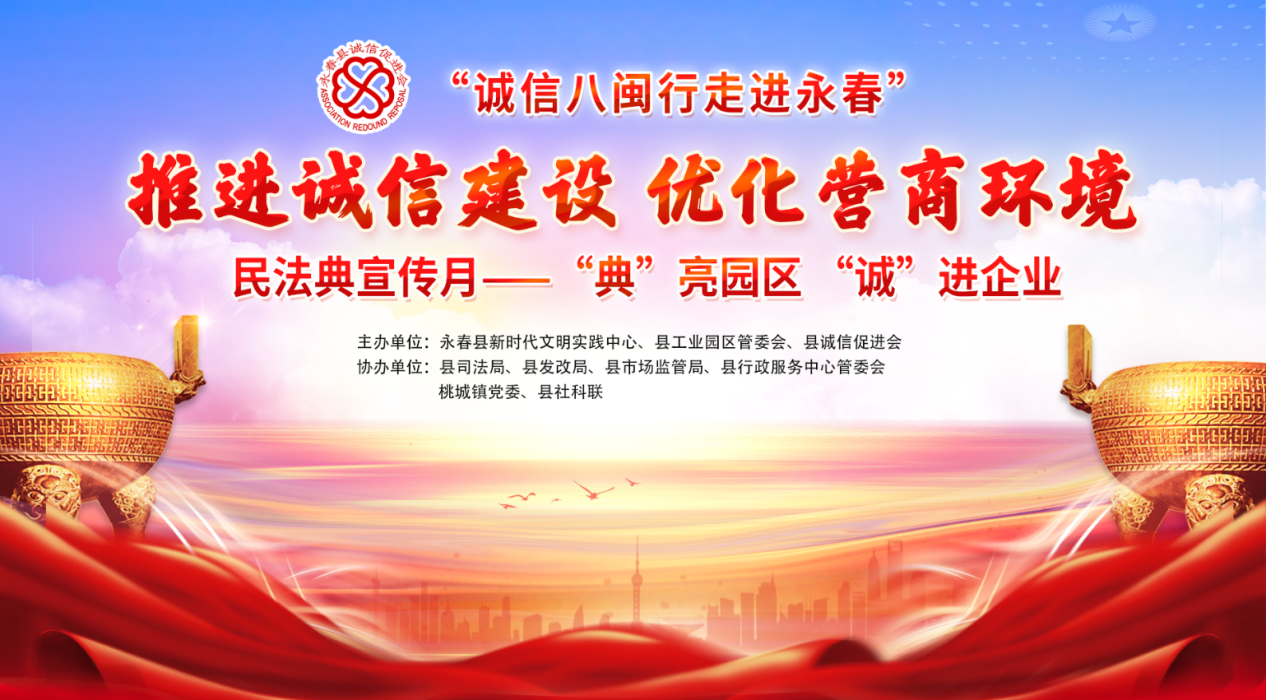 为推进诚信建设、优化营商环境,5月22日上午,由永春县新时代文明实践中心、县工业园区管委会、县诚信促进会主办,多部门协办的“诚信八闽行走进永春”之“推进诚信建设 优化营商环境”活动在怡辰科技厂区(县工业园区内)正式开展。此次活动作为“诚信八闽行走进永春”及民法典宣传月的重要内容,以“典”亮园区、“诚”进企业为核心,凝聚多方力量,为优化县域营商环境注入诚信动能。