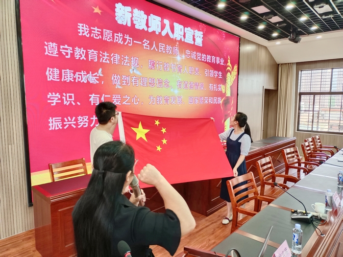 活动最后,全国优秀教师、全国优秀少先队辅导员、福建省学科带头人邹慧明老师带领全体新教师进行庄严的入职宣誓。174名新教师在国旗下作出志愿成为一名人民教师,为打响“学在永春”教育品牌砥砺前行、奋斗不止的铮铮誓言,宣誓活动增强了新教师的神圣感、责任感、使命感。