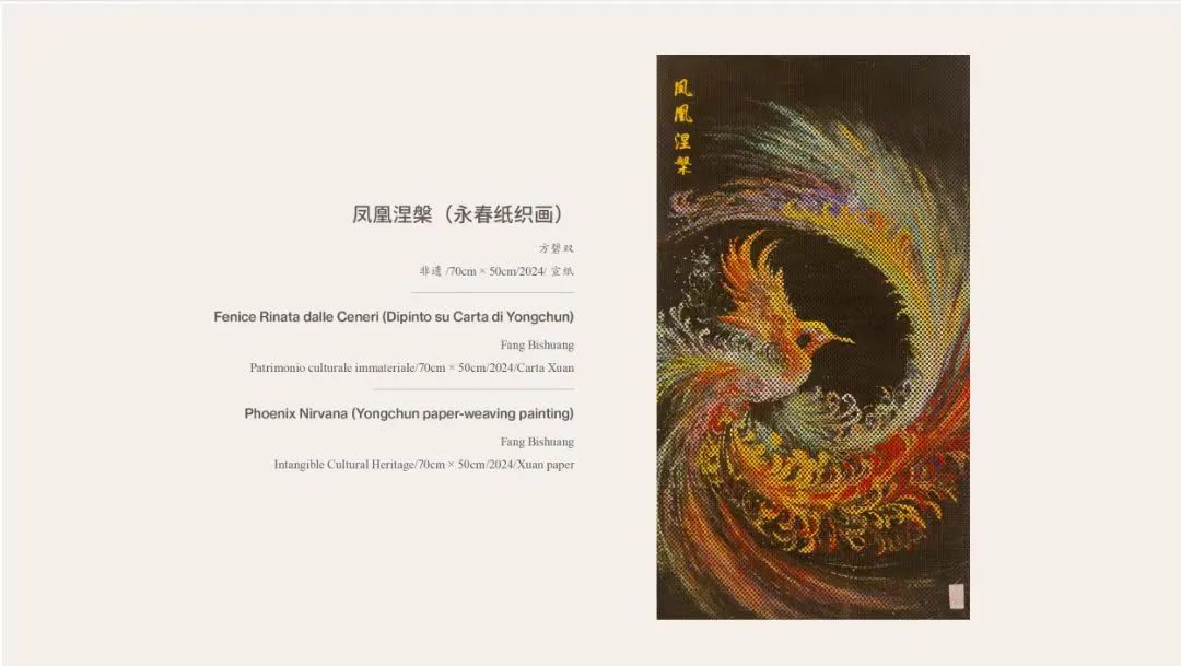 永春纸织画省级非遗代表性传承人、福建省工艺美术大师方碧双的作品《凤凰涅槃》受邀参展,吸引了众多意大利民众及艺术爱好者驻足欣赏,成为展览中的焦点之一。