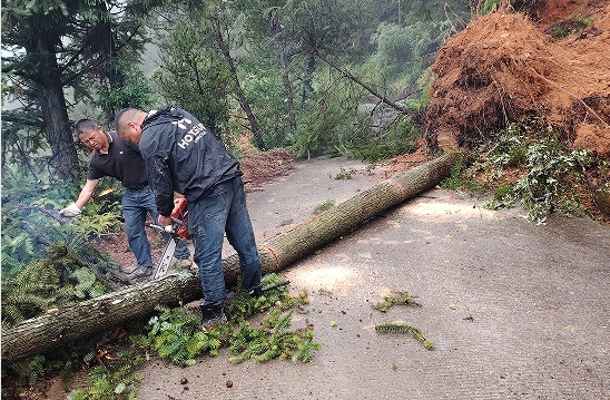 在完成现场管控后,乡政府、交通等部门调配了除草机等专业机械设备,对已经倒伏的树枝、滑落的泥石进行清理。经过连续1个小时的高效作业,阻断道路的树枝、泥石全部清理完毕,道路恢复了基本通行条件。