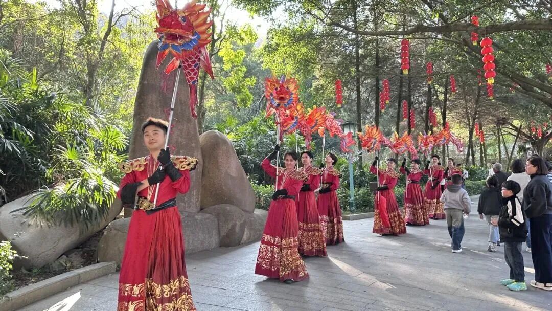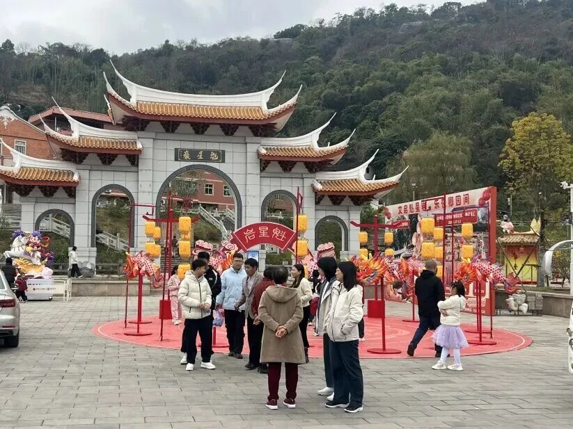 新春的魁星岩年味浓郁、文韵盎然,全域红灯笼高挂,魁星广场和百魁广场上鳌鱼灯阵、魁星灯阵璀璨夺目,鳌鱼灯阵巡游舞蹈灵动上演,闽南新春氛围感拉满。