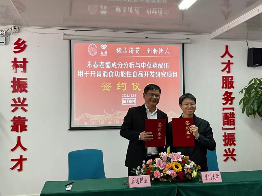 经与厦门大学药学院多次磋商,五道醋业拟依托厦大药学院研发平台,委托药学院专家团队,结合永春当地中草药资源,深度分析永春老醋成分,为老醋标准及研发提供数据支撑,同时开发老醋与中草药结合的功能性产品,探索永春老醋养生产业发展新道路。