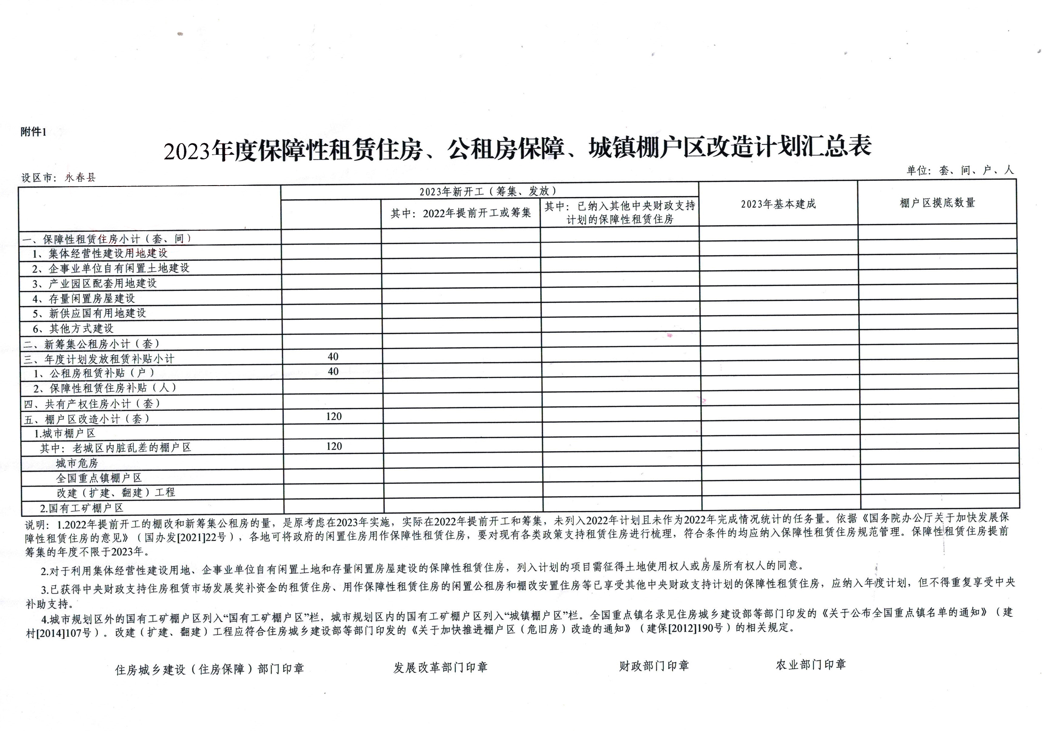 2023年度保障性租赁住房、公租房保障、城镇棚户区改造计划汇总表