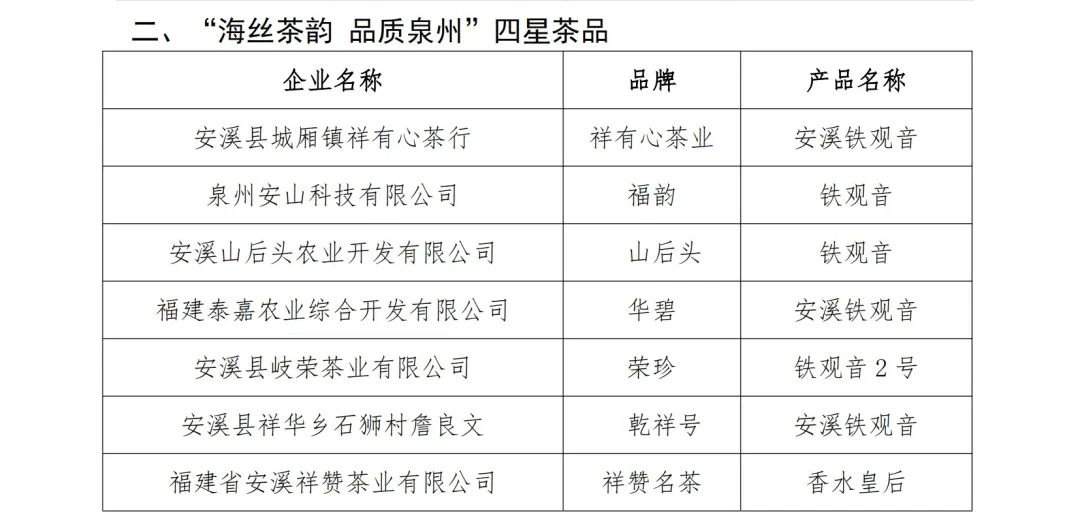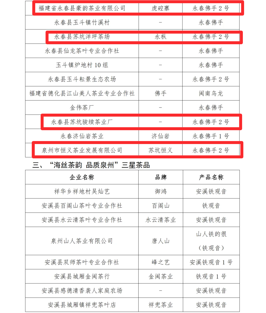 其中,来自永春县苏坑洋坪茶场2个茶样、永春县苏坑骏缘茶业厂2个茶样、泉州市恒义茶业发展有限公司2个茶样、福建省永春县豪韵茶业有限公司1个茶样,合计7个茶样被中国茶叶流通协会授予“海丝茶韵 品质泉州”四星茶品称号;来自福建永春县彬彬茶业有限公司2个茶样、泉州永春春莲茶叶专业合作社1个茶样、永春县苏坑洋坪茶场1个茶样、永春县苏坑锦珍茶场1个茶样、福建省永春县豪韵茶业有限公司1个茶样合计6个茶样被中国茶叶流通协会授予“海丝茶韵 品质泉州”三星茶品称号。这些获奖企业不仅展现了苏坑镇佛手茶的高品质,也进一步提升了苏坑镇佛手茶的知名度和美誉度。