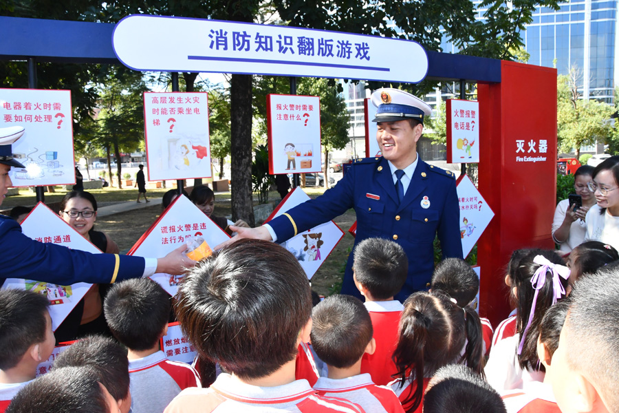“你提问我抢答”的游戏也很有趣,在消防知识翻板游戏,每一块翻板都是一条消防安全常识,在一问一答中,活跃了氛围也提高了学生的安全意识和自我防护能力。