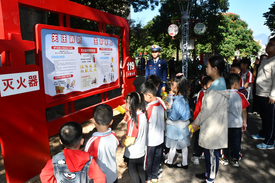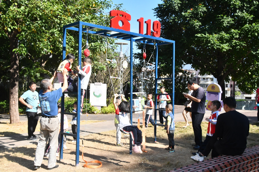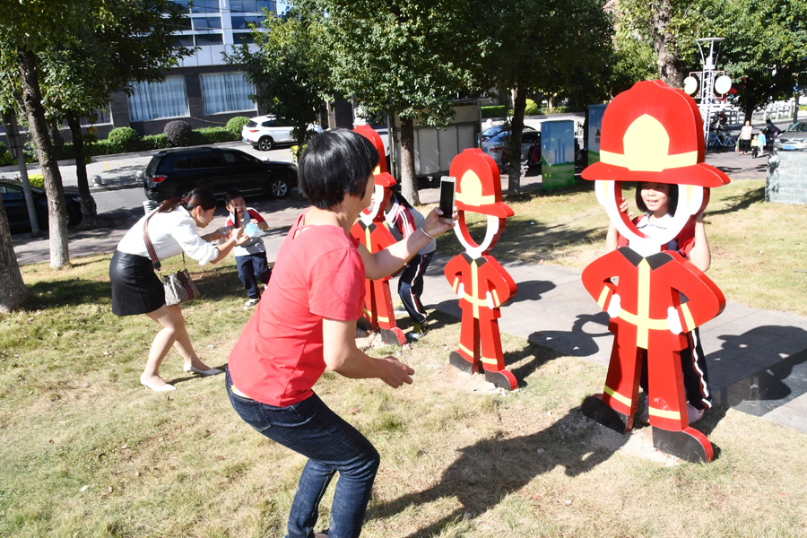 一走进主题公园,学生们就被精心设计的消防元素的卡通漫画人物所吸引,纷纷走上前去合影。在消防指战员的带领下,大家一一观看了消防主题造型、消防宣传栏等极具消防特色的设施,这些设施紧扣“应急消防”主题,突出了“平安”文化色彩,指战员一边解说,一边结合公园实际用开展消防安全培训,用通俗易懂的语言深入浅出地就日常工作和生活中如何防止火灾发生、如何消除火灾隐患以及发生火灾后如何自救逃生等基本的消防安全常识进行了普及。