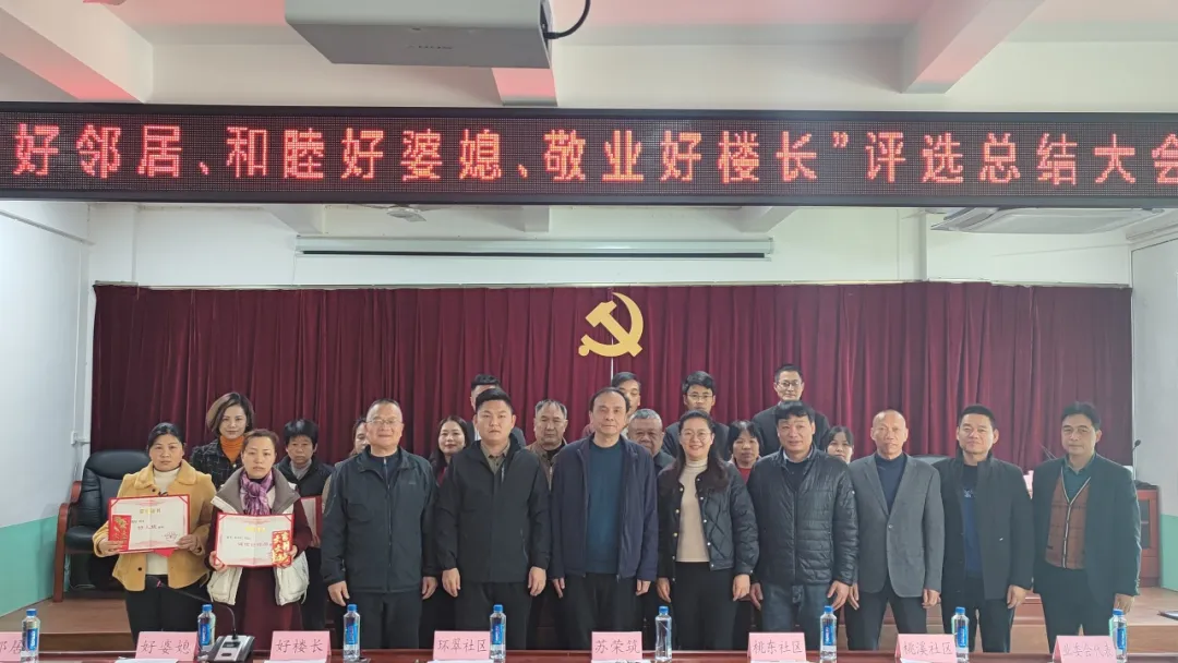 宣布今年“诚信好邻居、和睦好婆媳、敬业好楼长”评选的获奖结果,并为获奖者颁奖。