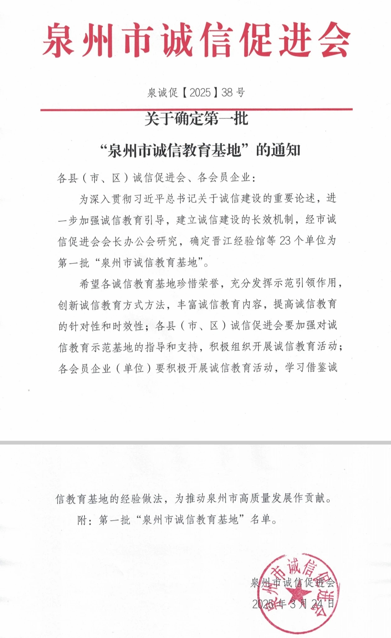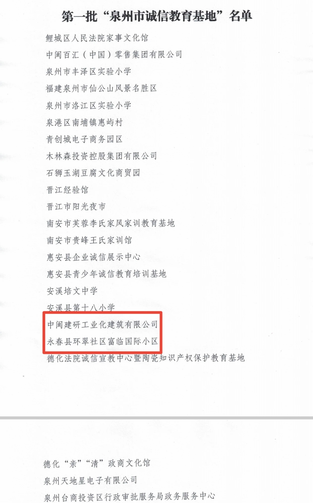 近日,泉州市诚信促进会公布首批“诚信教育基地”名单,永春县诚信教育基地“中闽建研工业化建筑有限公司”、“永春县环翠社区富临国际小区”荣耀入选。