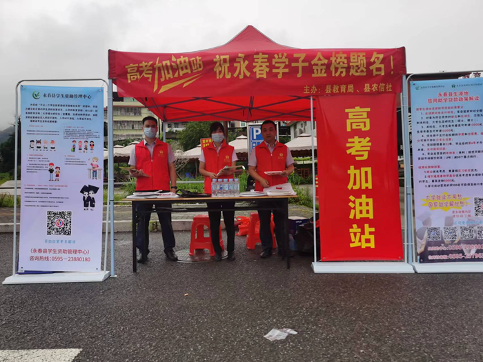 高考期间,结合疫情防控需求,永春县教育局、永春县学生资助中心联合永春县农村信用社、邮储银行永春支行等单位在高考考点共同布设“高考加油站”,为考生和家长准备了防疫口罩、免费饮用的矿泉水、藿香正气水、考试用品等物资。同时,志愿者们搭建了遮阳棚,为考生和家长提供休息区,营造安心舒适的考试环境;在考点现场,志愿者们积极宣传国家资助政策,解读生源地信用助学贷款政策。(计财股)