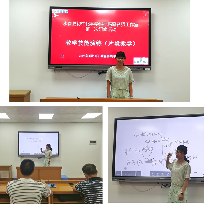 接着由林亚兰老师进行工作室研修课题的介绍。林亚兰老师从研究思路和预期的研究成果两方面介绍了研修课题。林梅琼老师进行教学技能演练(片段教学):《化学方程式的书写》。名师工作室的各成员对林梅琼老师的片段教学进行交流研讨。老师们对林老师的片段教学进行了充分的肯定,并在某些细节的处理上提出了各自的看法,研讨氛围积极和谐。