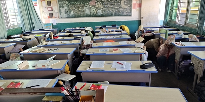 随着警报响起,各楼层老师迅速到达指定位置,班主任告知学生“地震来了,不要慌”,并指挥学生迅速推凳、拿书(书包)护头、闭眼,躲在课桌下,尽量蜷曲身体,降低身体重心。