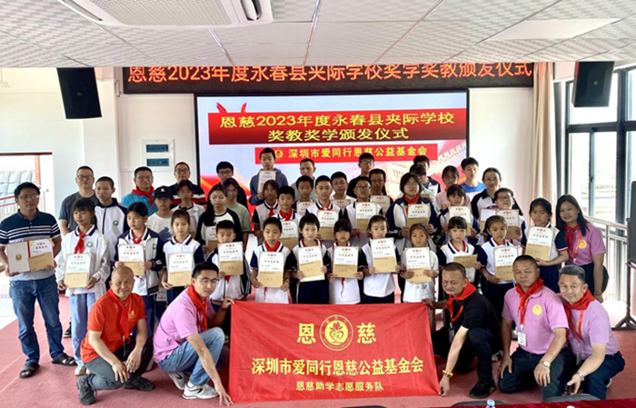 在充满关爱的氛围中,深圳市爱同行恩慈公益基金会的爱心人士们为获得恩慈公益奖学金的学生颁发获奖证书和奖学金,并为四名优秀教师颁发证书和奖金。