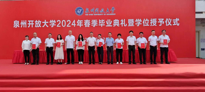 永春学院泉州开放大学优秀毕业生代表郑大德(右三)、邱玉凤(右五)上台领奖