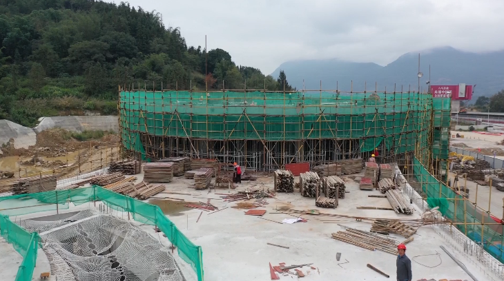达埔服务区综合楼以机场设计标准进行设计,采用“香花”和“云烟”为设计意象,室内采用混凝土结构,外立面采用钢结构,首层高度为5.7米,总高度到达18.5米,是集旅游、观光、购物、展示、商务为一体的综合性服务楼。目前,该项目已迅速展开综合服务楼的二次结构及装饰装修施工。