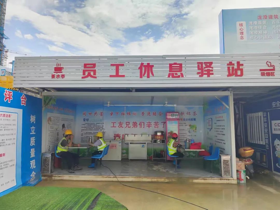 为了让高温作业下的工人能够得到有效的休息,工地在阴凉处设置了员工休息驿站,并提供茶水、绿豆汤等防暑降温茶水供工人饮用,保证施工现场饮水充足,避免发生中暑事件。现场还配备充足的清凉油、风油精、藿香正气水等,并在现场设置喷淋降温、洒水设备,达到了降温的效果。