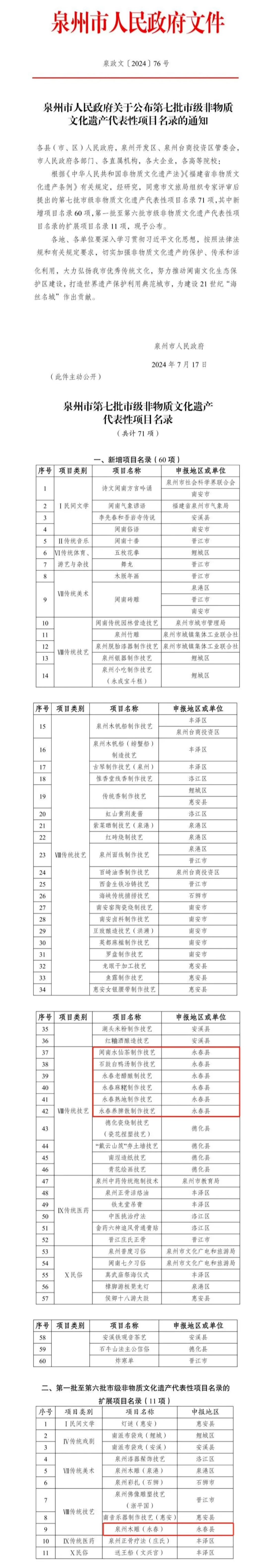 7月17日,泉州市人民政府公布了第七批市级非物质文化遗产代表性项目名录,涵盖了民间文学、传统技艺、传统医药等8个大类,共计71项。其中永春新增七项市级非物质文化遗产项目,分别是闽南水仙茶制作技艺、石鼓白鸭汤制作技艺、永春老醋酿制技艺、永春麻粩制作技艺、永春熟地制作技艺、永春养脾散制作技艺和泉州木雕(永春)。