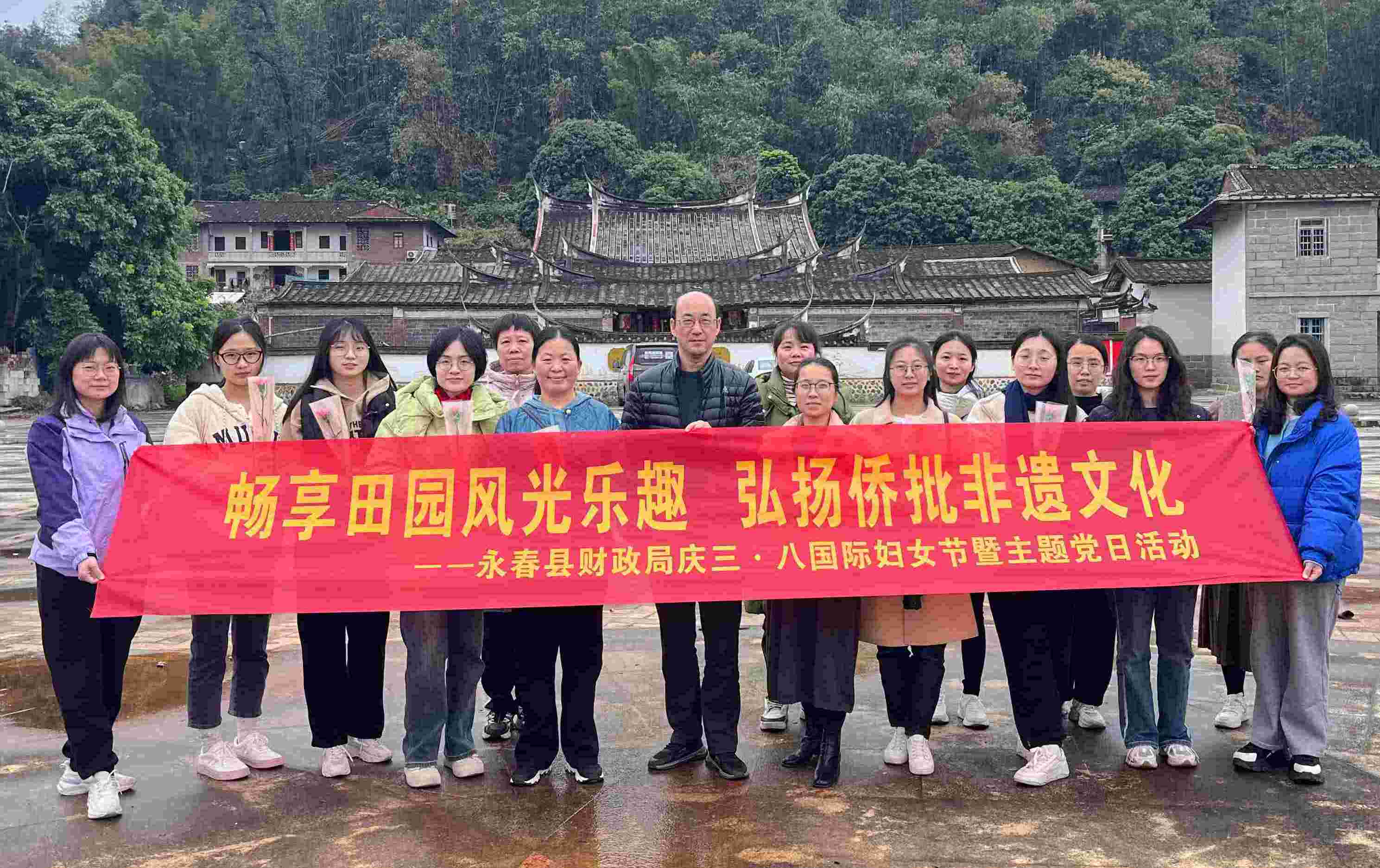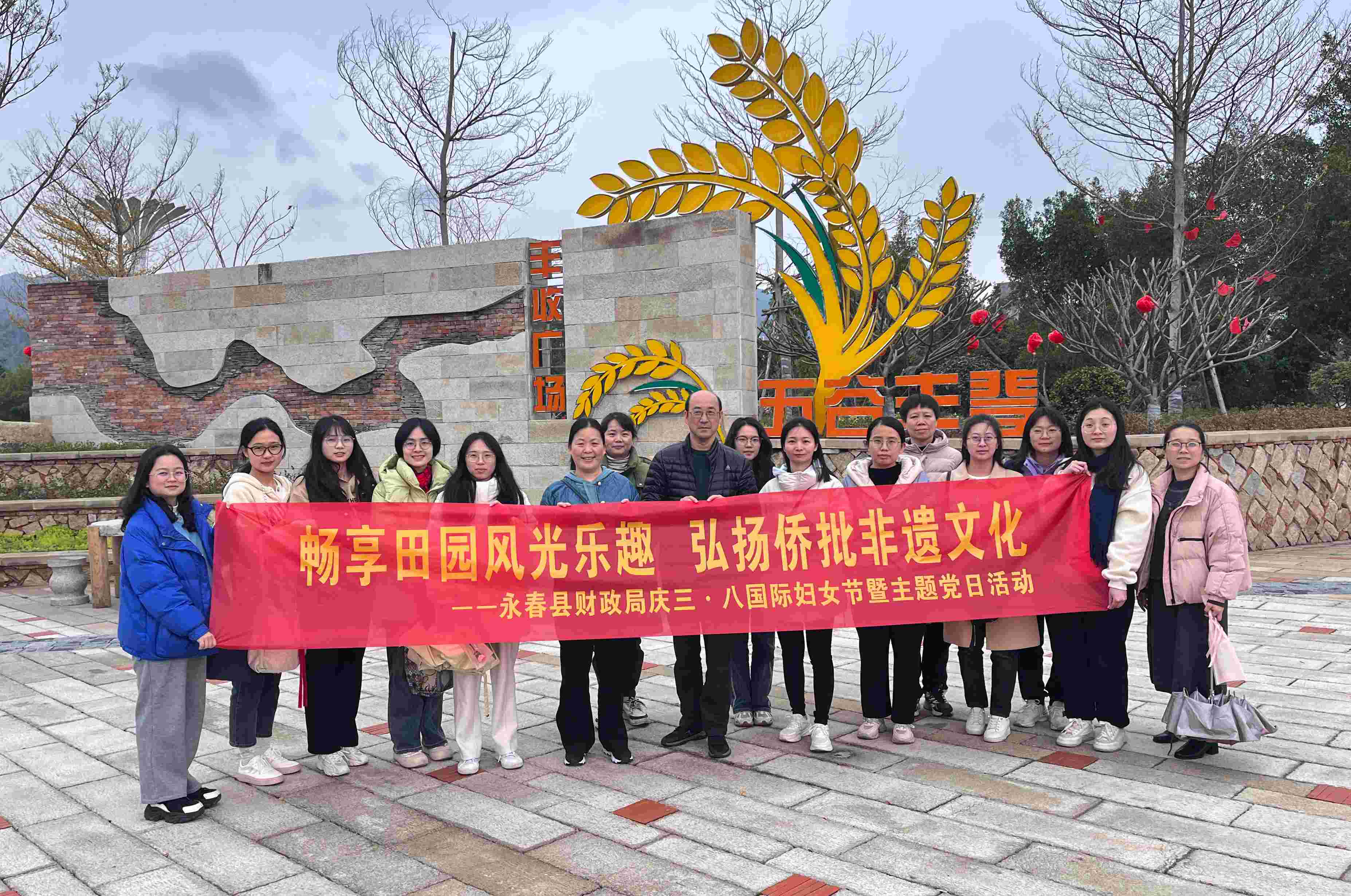 2025年3月8日,永春县财政局聚心策划庆祝第115个“三八”国际劳动妇女节的来临,组织全体女职工到石鼓镇开展了一场极具特色与深意的“畅享田园风光乐趣 弘扬侨批非遗文化”主题活动,将沉浸式文化体验与田园互动完美融合,展现新时期财政女性独特魅力、厚植家国情怀的风采。