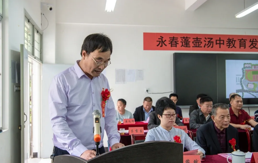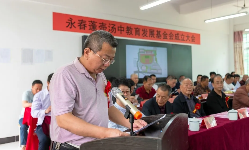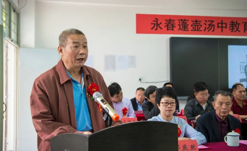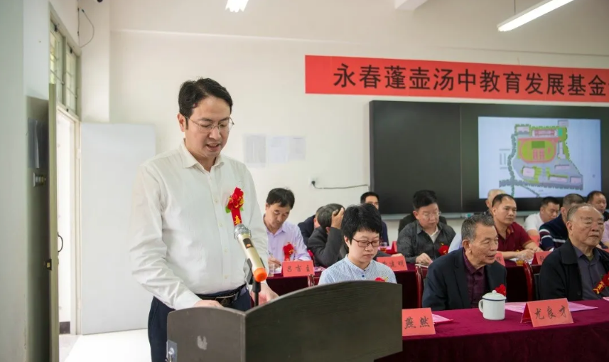 永春县政府副县长颜一鹏向永春蓬壶汤中教育发展基金会的成立和荣任理事会、监事会成员的各位乡贤表示祝贺。对汤城中学教育发展提出希望:学校要发扬优良传统,狠抓教育教学质量;老师要爱岗敬业,严谨笃学、关爱学生;大家要共同努力,为打磨“学在永春”区域教育品牌,为把教育办成永春人民的骄傲作出更大贡献。