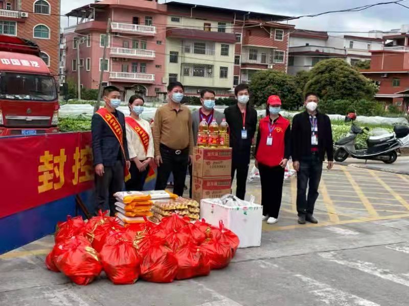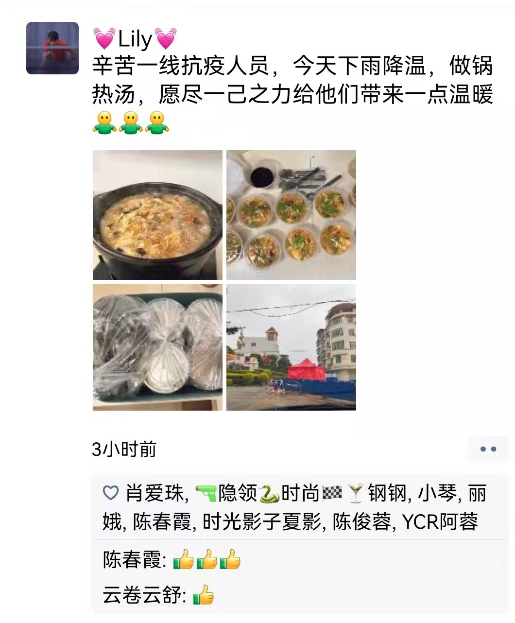 封控区的工作人员24小时值班,随时了解封控人员的生活状况,落实各项管控措施,在生活和心理上及时给予关心关爱。3月23日,新发超市负责人带领超市志愿者为每户封控家庭送去食用油、米、蔬菜等生活必需品,表达关爱之情,激发他们战胜疫情的信心。阳光乒乓球培训基地负责人林丽丽为封控区专班人员送来有爱心营养又丰富的鱼翅羹、王老吉、绿豆汤和水果,以实际行动协力助抗疫。