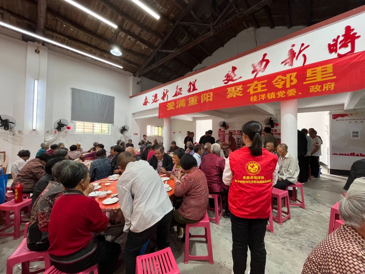 爱心午餐送幸福。金沙村“党建+”邻里中心、新岭村、岐山村、文太村、茂春村、库湖村为本村70岁以上的老人开展爱心免费午餐活动。老人们围坐在餐桌旁,在温馨的氛围中品尝着热腾腾的饭菜,聊着家常,浓浓的邻里情谊和幸福的味道在这一道道菜肴中相互传递。