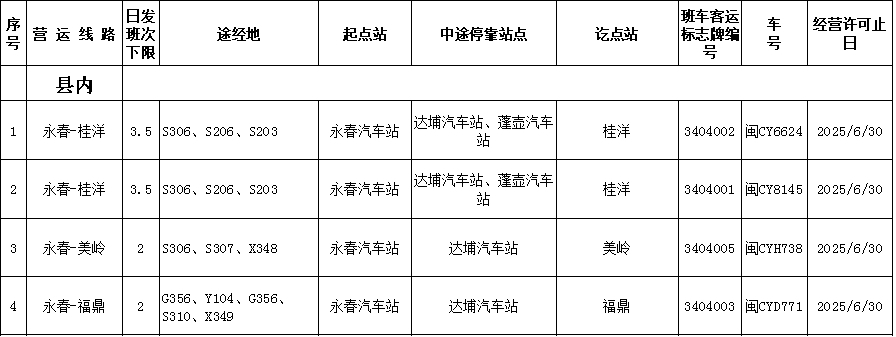 欢迎道路客运经营业户及社会各界监督。如有异议,请在公示期内以书面形式反馈至永春县交通运输局,并请署名及附联系方法(以单位名义请加盖单位公章)。