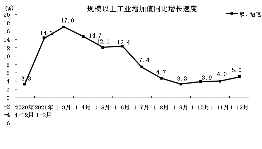 2021年1-12月份,规模以上工业增加值累计同比增长5.0%。