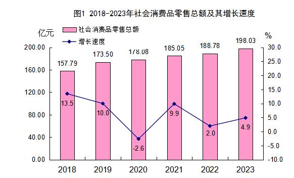 全年社会消费品零售总额198.03亿元,比上年增长4.9%。其中,限额以上单位消费品零售额30.43亿元,下降1.3%;限额以下单位消费品零售额167.60亿元,增长6.1%。