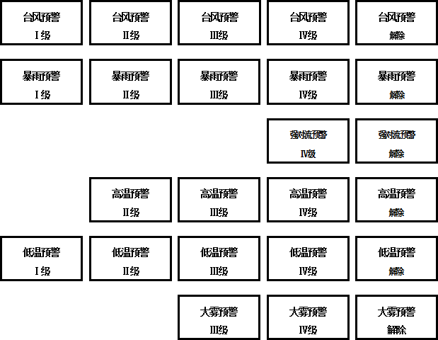 Ⅳ级预警:预计未来24小时有6个及以上乡镇将出现9级阵风及以上雷暴大风、冰雹或龙卷风,或者已经出现并可能持续。