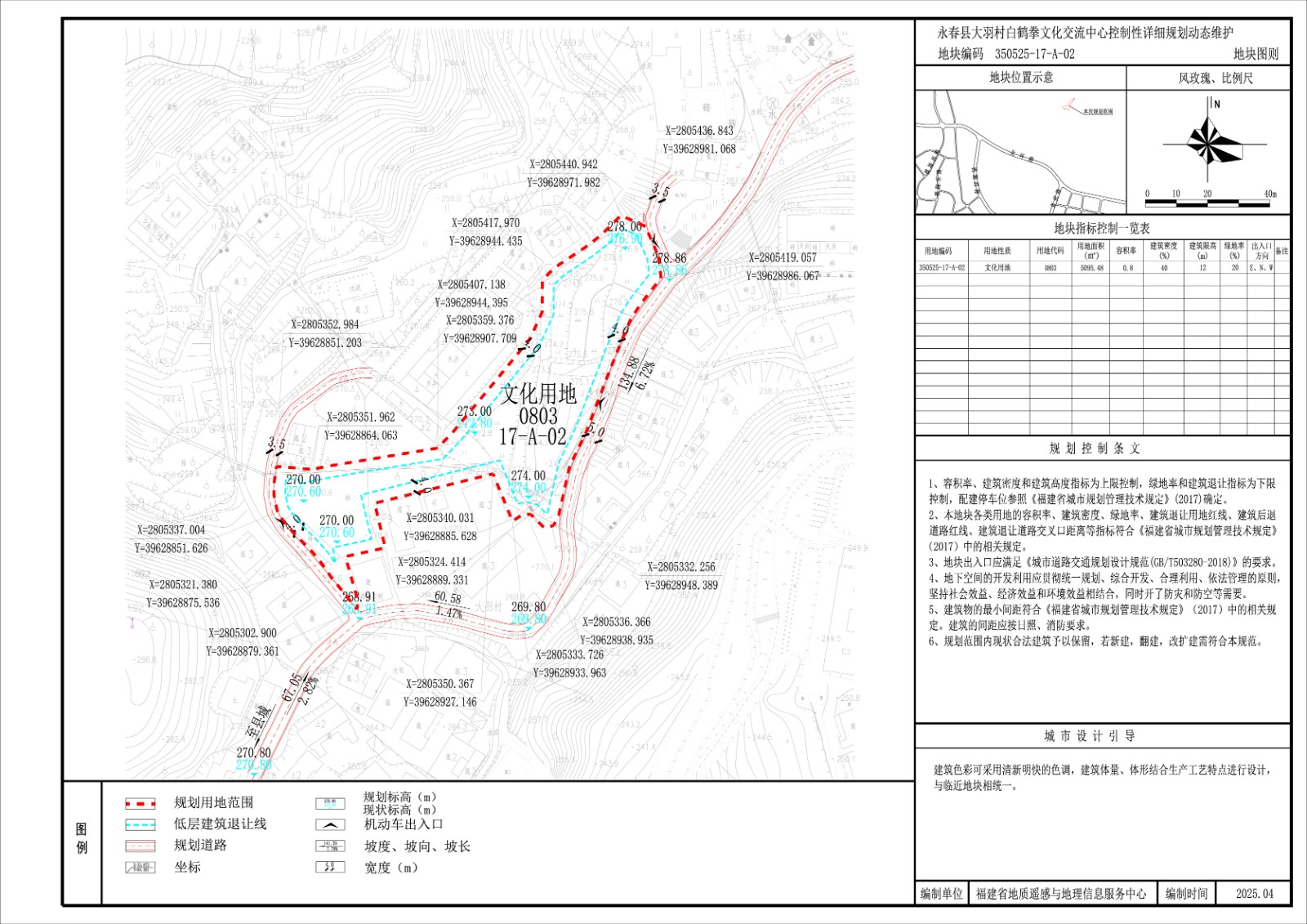 为进一步合理规划空间布局,加强永春县城区规划管理工作,特委托福建省地质遥感与地理信息服务中心编制《永春县大羽村白鹤拳文化交流中心控制性详细规划动态维护》。