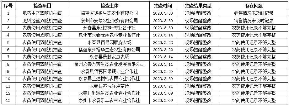 根据《永春县农业农村局关于印发2023年“双随机、一公开”抽查工作方案的通知》(永农发〔2023〕51号)文件要求,我局开展2023年上半年肥料生产、经营,农药使用双随机抽查,现将结果公布如下: