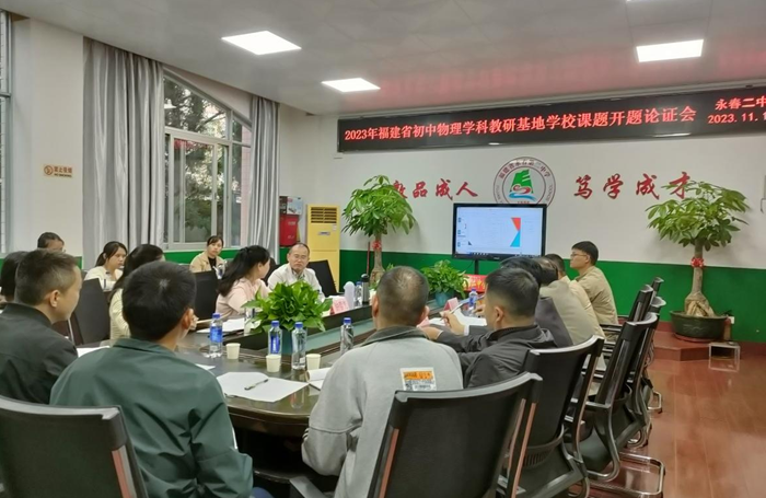 为提高课题研究质量,更好地发挥省级基地学校教育科研的引领作用,11月14日,永春二中举办2023年福建省初中物理学科教学研究基地学校课题——《基于“备、教、学、评一体化”的初中物理探究实验教学研究》开题论证会。福建省普教室物理教研员钟春光、泉州市教科所初中教研室主任、物理教研员林一敏作为课题开题论证会专家出席了本次会议,永春二中校长康贵泉、永春县物理教研员康景华、永春二中副校长颜良志、课题组全体成员参加会议。