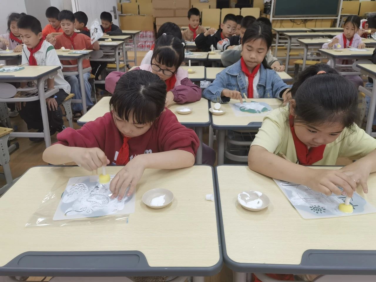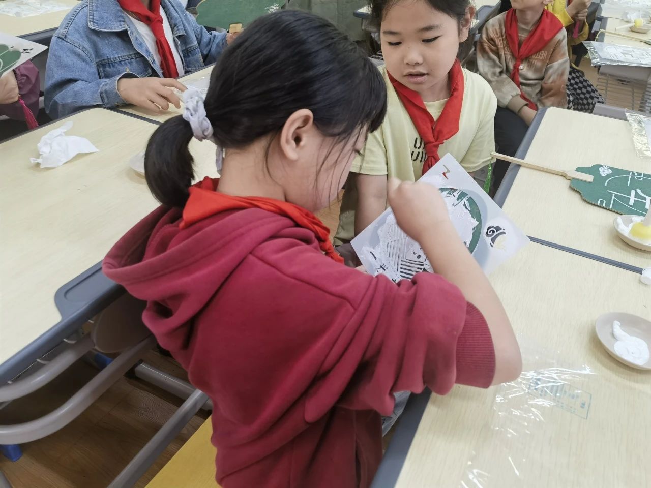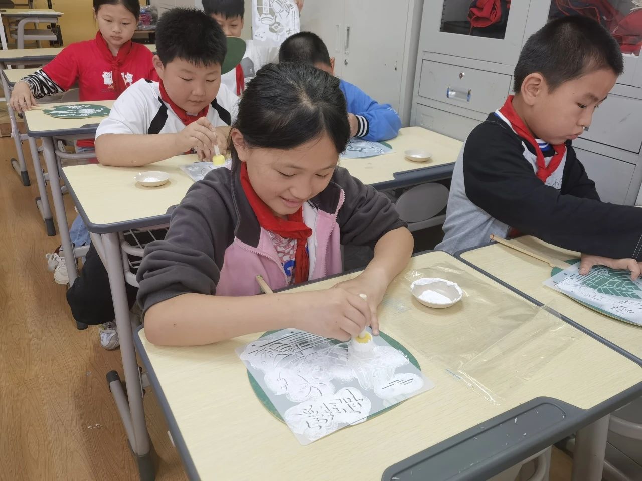 随后,志愿者带领同学们一起制作端午拓印团扇,同学们热情高涨,纷纷动手挑选心仪团扇、拓印模板,在团扇上精心印制出粽子、龙舟、艾草等端午元素,一把把独具特色的团扇在孩子们手中逐渐成形。 此次活动,不仅提高了孩子们的动手能力,丰富了孩子们的想象力和创造力,更让他们感受到中华优秀传统文化的深厚底蕴。