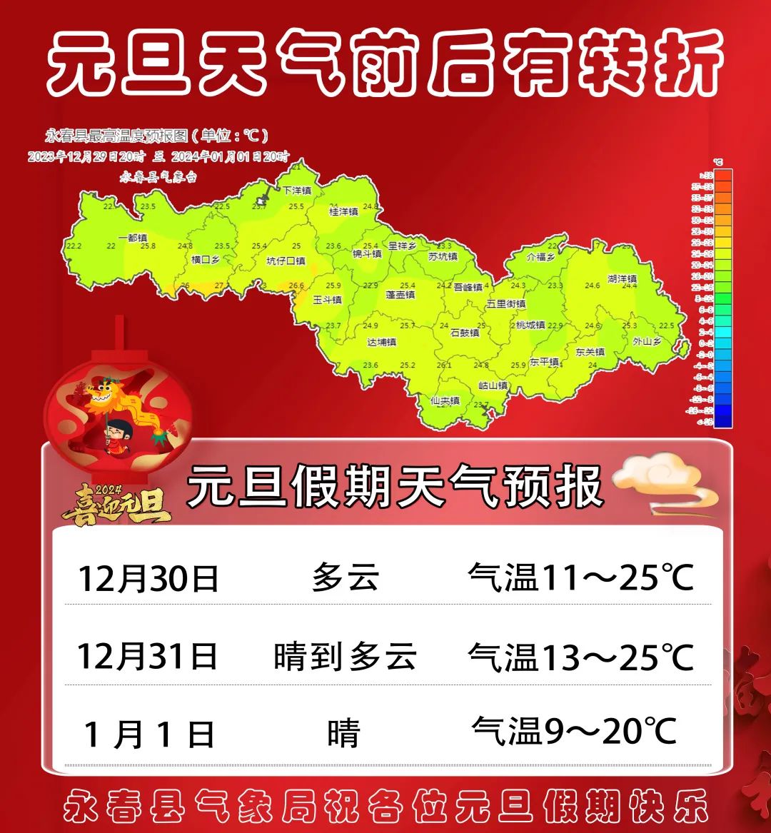 不知不觉,2023年要过去了,在这最后的几天,天气还是很给力的,午后最高气温在25℃上下。不过,到了31日夜间,冷空气赶着来“跨年”,届时气温将会回落,夜晨最低气温会跌至个位数。