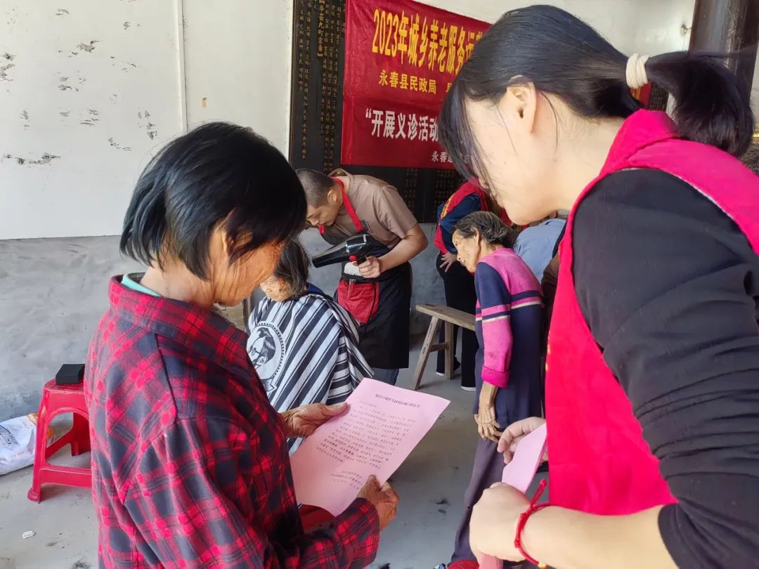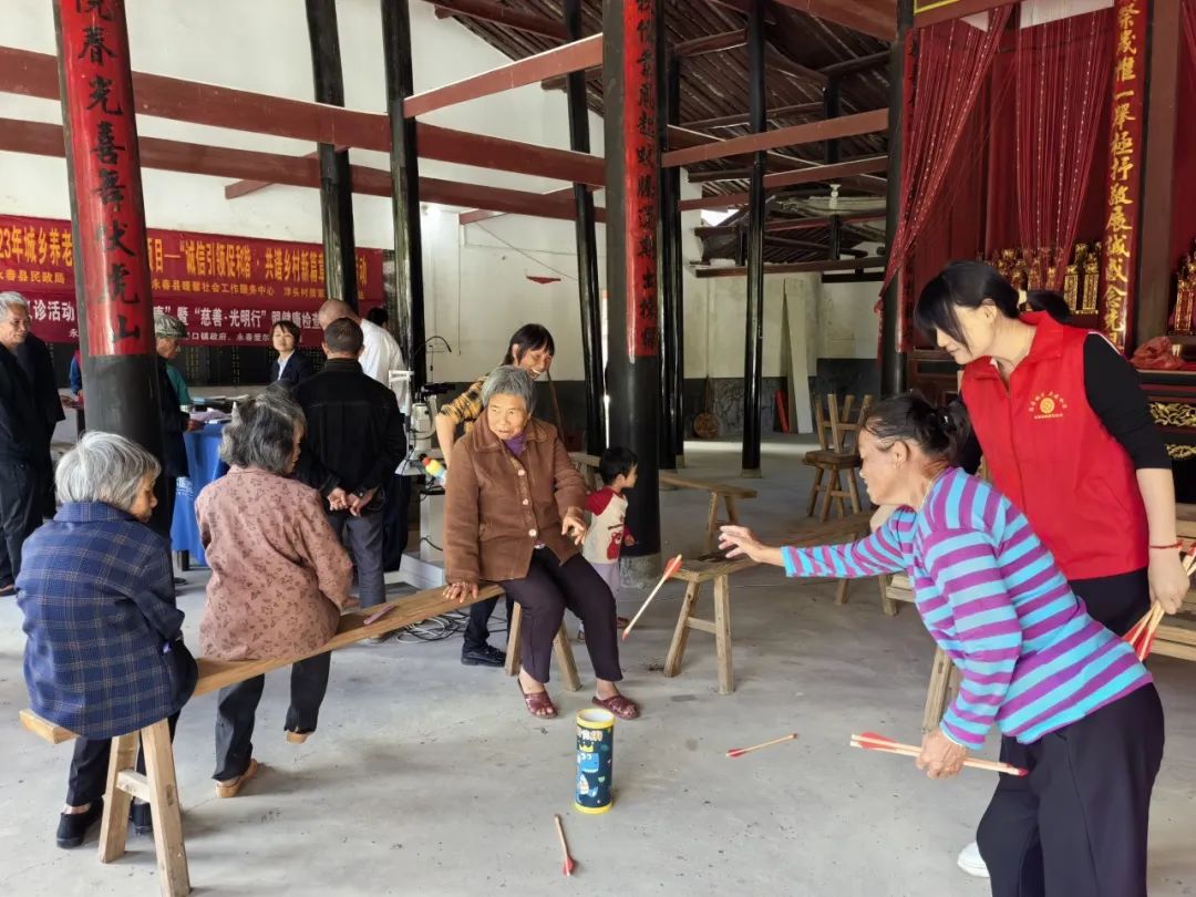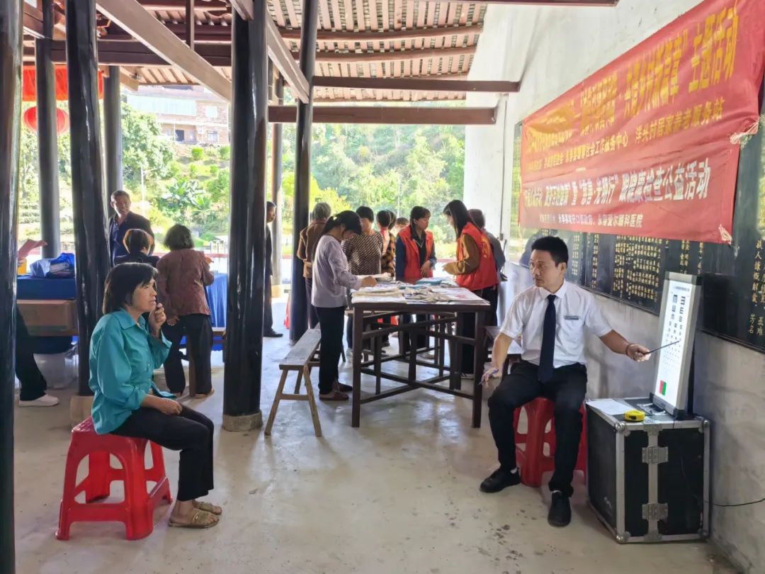 另一边义诊活动同时进行,社工引导老人有序排队,细心帮助他们进行信息登记。眼科医生利用专业仪器为老年人免费进行视力检查,解答就诊老年人关于眼部疾病的疑惑,提供专业的建议和治疗方案,帮助大家更好地了解自己的视力状况,及时发现并解决视力问题。