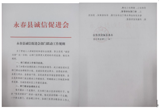 创新一个机制。既部门联动工作机制。县诚信促进会联合县委组织部、县委文明办、县委老干部局、县民政局、县市场监督管理局、县应急局等多个部门进驻社区邻里中心,制定部门联动工作细则,充分发挥各自优势,多方发力,推进诚信进社区工作走深走实。