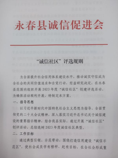 永春县诚信促进会紧扣“诚信永春”总体目标,围绕诚信“6+N”工作,在“全”上着眼、在“域”上发力,创造性开展“六个一”工程,积极推动诚信“进社区”全域布局、全域宣传覆盖,诚信社区建设工作成效显著。
