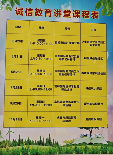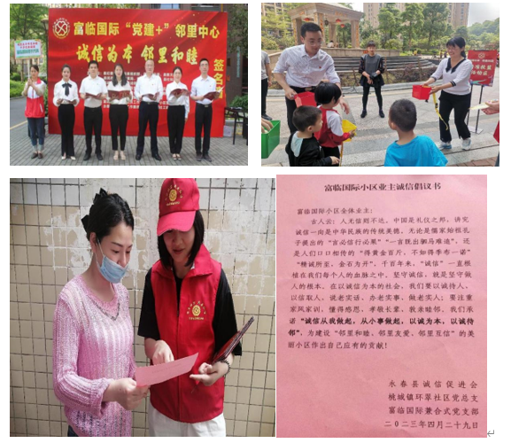 开展一次征文。开展“七彩富临 幸福邻里”小学生征文主题活动,组织小区近邻导师评选,并把优秀作品报送县委组织部、县县直机关教育系统委员会主办的2023年永春县近邻学堂“庆六一,话邻里”主题比赛,荣获三等奖,本次活动让小区孩子们受到了诚信的教育,并让诚信的种子在孩子们心中生根发芽。