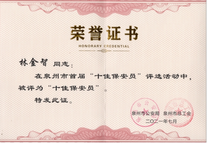 日前,永春电大2021年春季专科行政管理专业学员,永春县保安服务公司工会主席、押运分公司副队长林金智从全市5万多名的保安员中脱颖而出,荣获泉州市首届“十佳保安员”。