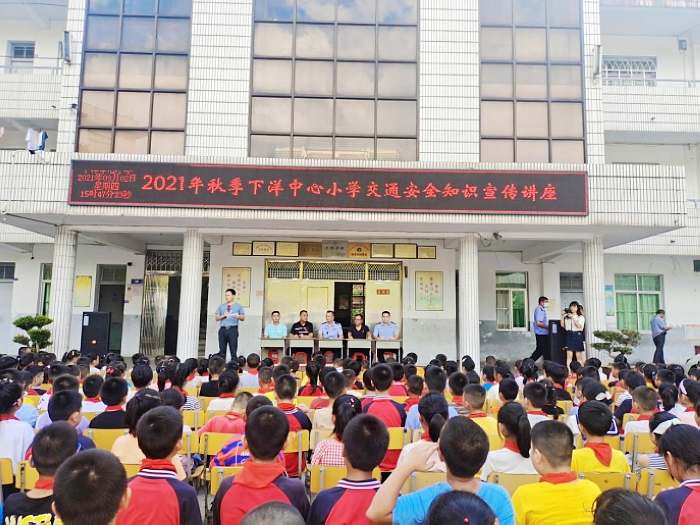 为宣传交通安全知识,培养学生良好的交通安全意识,强化学生自我安全保护能力,9月2日下午,下洋镇中心小学邀请下洋镇综合执法队队长王大根、下洋交警中队中队长康金得、下洋派出所民警苏旭霖来校,为下洋中心全体师生作“小学生交通安全知识讲座”。