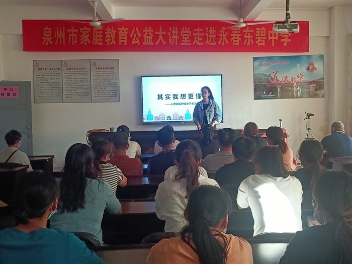 为加强家校之间的沟通,提高家庭教育的水平,做好家校共育工作,提升家长家庭教育智慧,11月21日,东碧中学邀请国家二级心理咨询师、青少年生涯规划师、永春县心理卫生协会副秘书长陈丽云老师,为初一年学生家长作《其实我想更懂你》青春期亲子沟通的公益讲座。