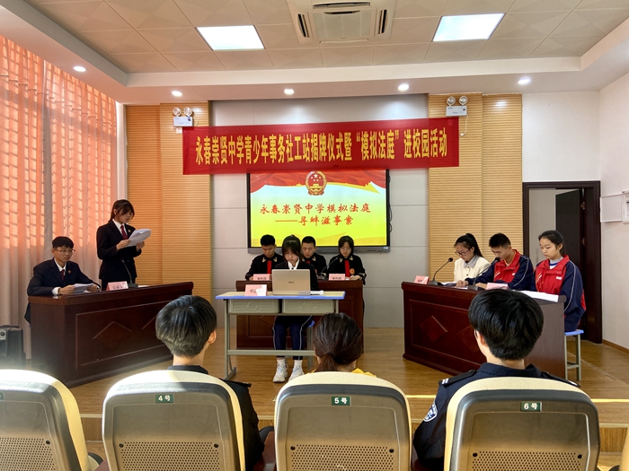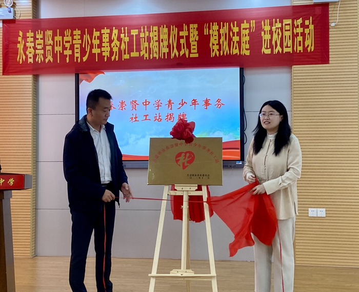 12月11日,永春县崇贤中学举行“青少年事务社工站”成立揭牌仪式暨“模拟法庭”进校园活动。该社工站是永春县成立的首家学校社工站。永春县政府副县长董婧参加。