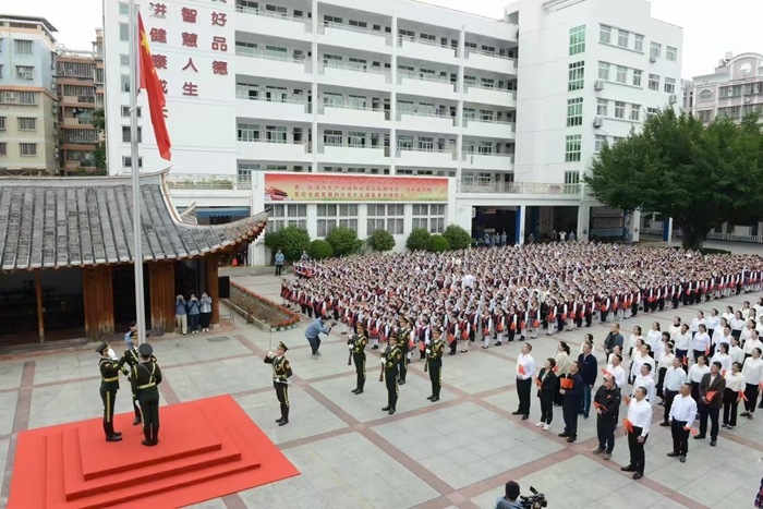 上午九时,伴随着雄壮的中华人民共和国国歌,原天安门国旗护卫队队员们昂首挺胸,步伐坚定,擎着五星红旗庄严走到升旗台。当雄壮的国歌响彻校园,五星红旗在全体师生的注目礼中冉冉升起,那一刻,师生们心中涌动着对祖国的无限热爱与自豪,国旗下的每一个面庞都写满了赤诚与敬意,爱国之情油然而生。
