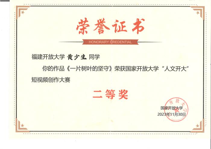黄少生兼具创作才华与社会责任,创作的《一片绿叶的坚守》等短视频,在国家开放大学、福建开放大学各类赛事中获得二、三等奖,生动传播茶文化与匠心精神。作为永春县第十六届政协委员,他关注产业发展,热心公益事业,为乡村学校、乡村建设等捐款10多万元,无偿推广制茶技术带动农户增收,获评福建省、永春县“百姓学习之星”,泉州市优秀农村实用人才。