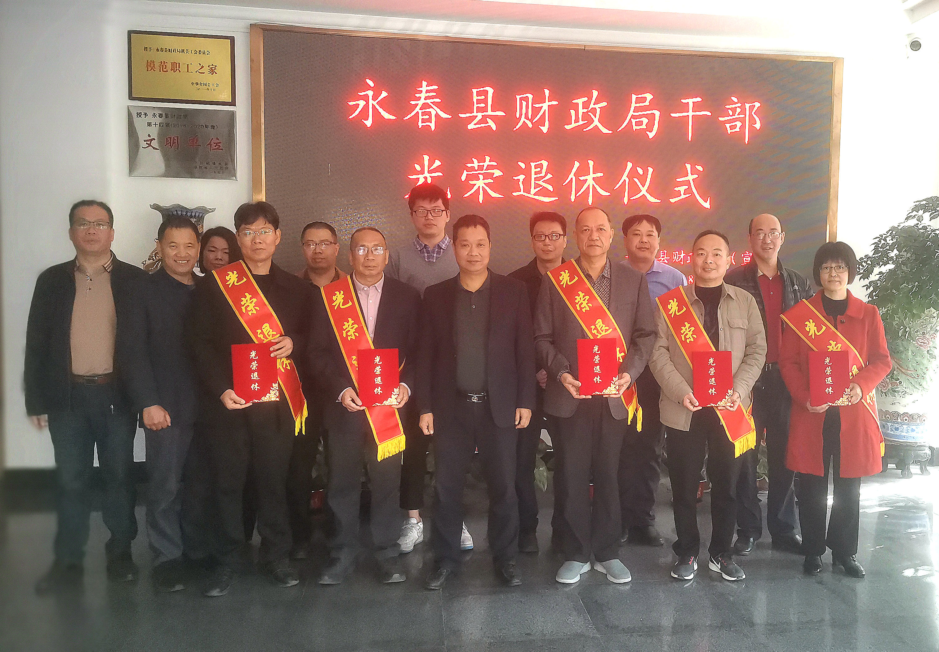 1月18日上午,永春县财政局举行2023年度干部施文炳、郭栋灿、刘国栋、潘晓清、林荣海、蔡黎冰六位同志光荣退休欢送仪式。局党组书记、局长周智鸿同志及部分在家的科级领导、相关股室负责人、局机关工会委员等同志参加仪式,局机关工会主席林金建同志主持仪式。