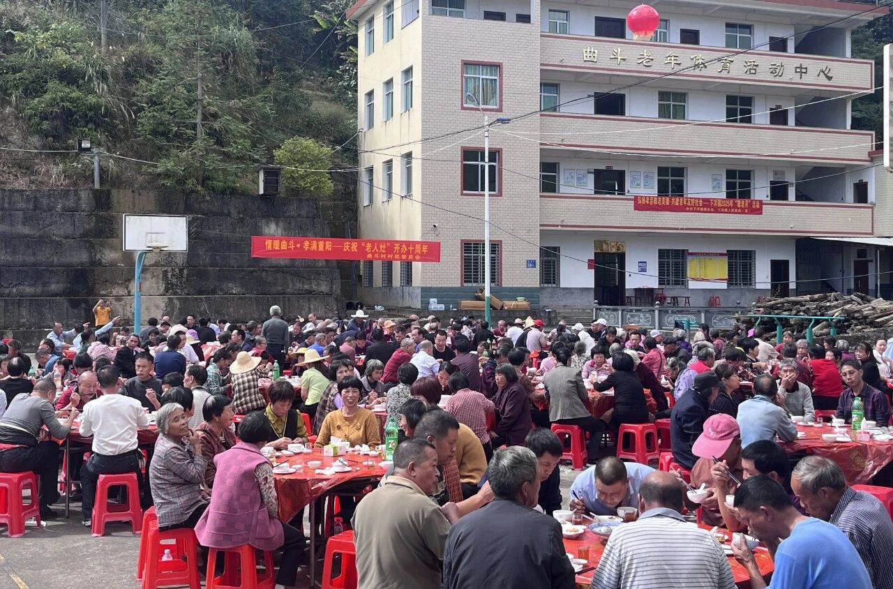 正午时分,重阳家宴正式开席。老人们围坐在一起,像家人般唠着家常、品尝佳肴,有的老人还主动给身边的伙伴夹菜,老年活动中心现场满是“家”的温暖与烟火气。