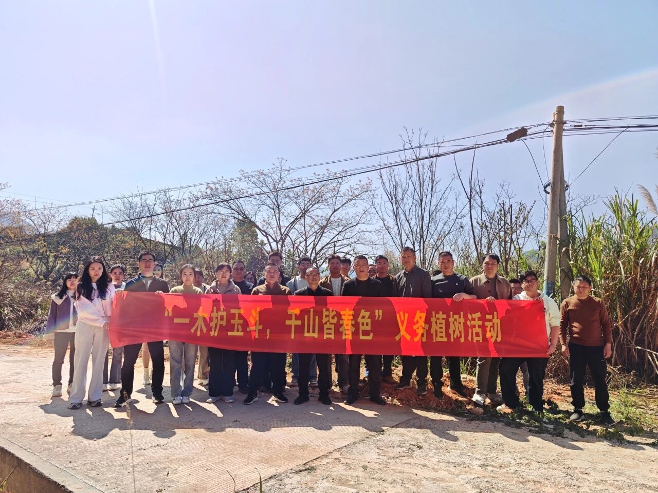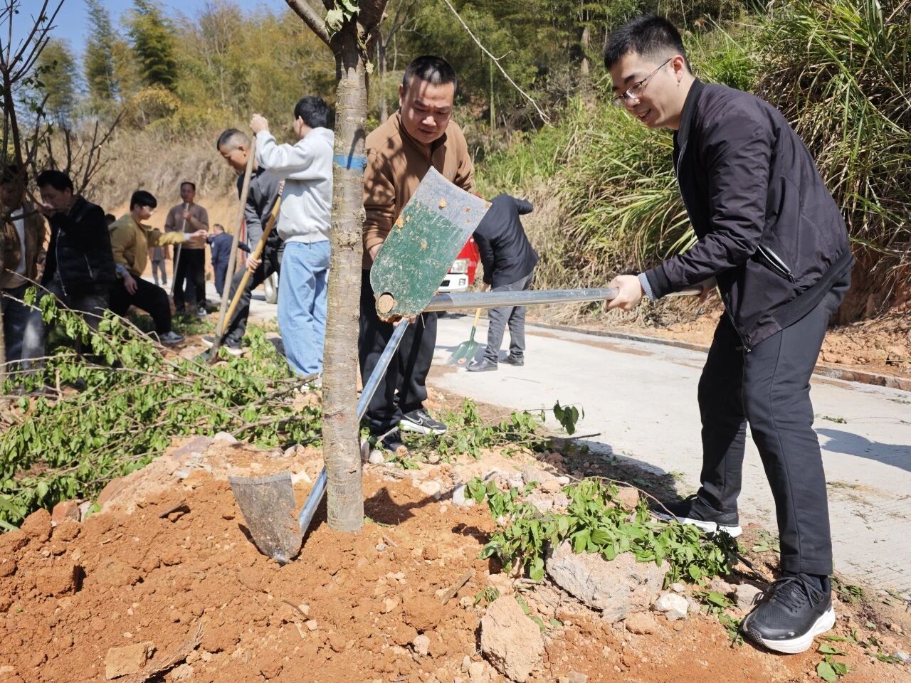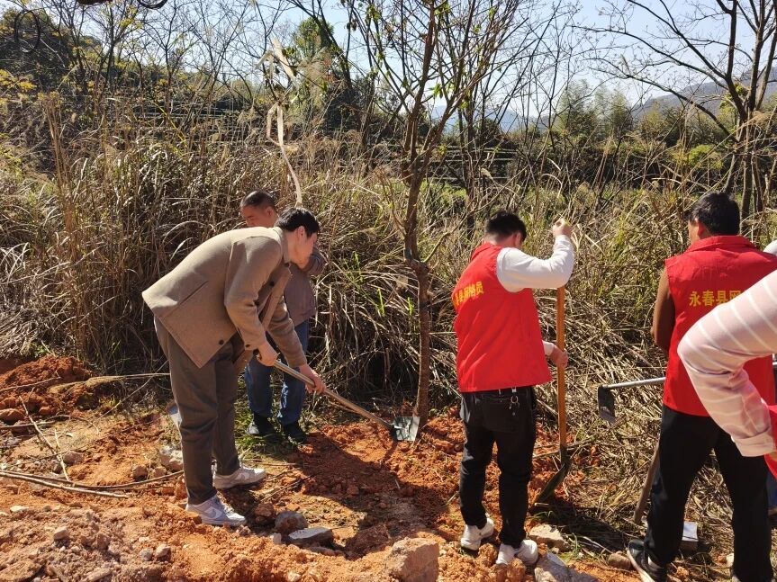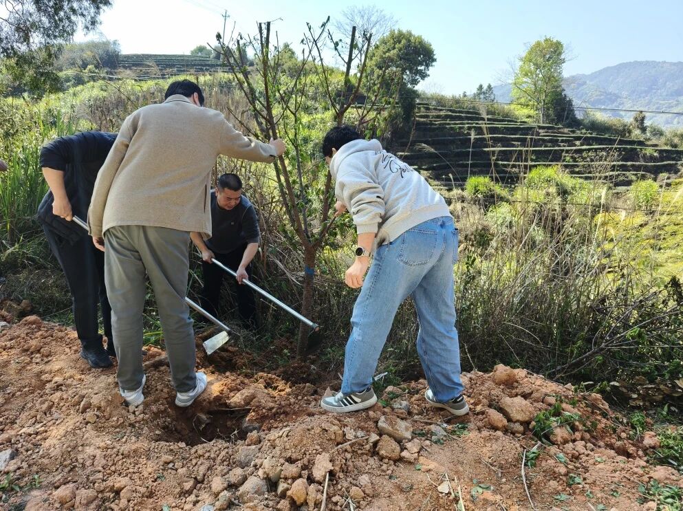植树现场一派热火朝天的劳动景象。大家三五成组、分工协作,从挥锹铲土、挖坑定穴,到扶苗固干、培土压实,再到悉心浇水、围堰保墒,每一个环节都一丝不苟、配合默契。经过全员共同努力,一棵棵新树苗稳稳扎根、舒展新绿,为玉斗镇的生态版图增添了一抹清新亮色,也注入了绿色发展的生机与活力。