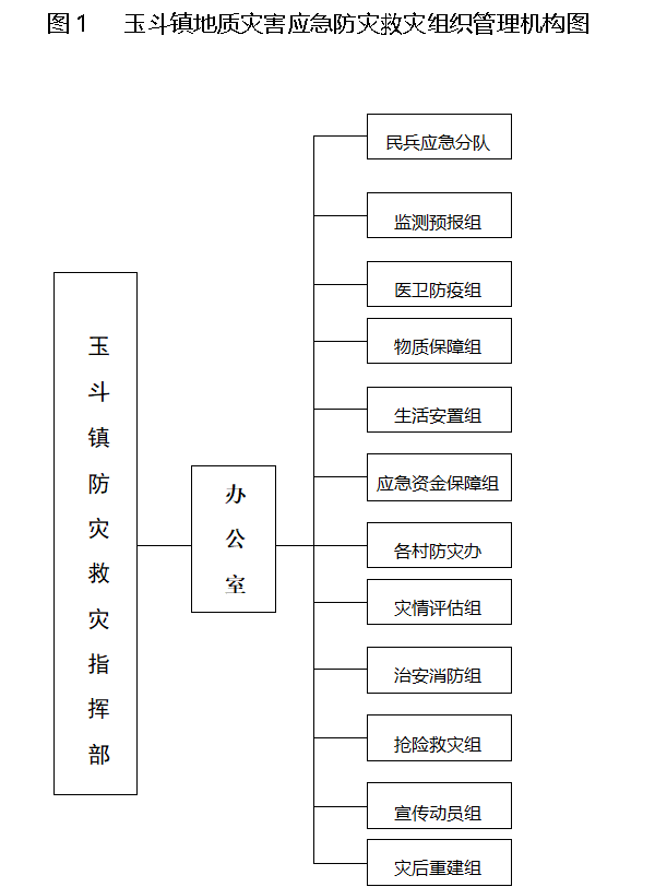 镇地质灾害防治应急指挥部下设办公室,挂靠玉斗自然资源所,办公室主任由玉斗自然资源所王智强担任,人员由玉斗自然资源所及镇村镇站、林业站、水利站等人员组成。
